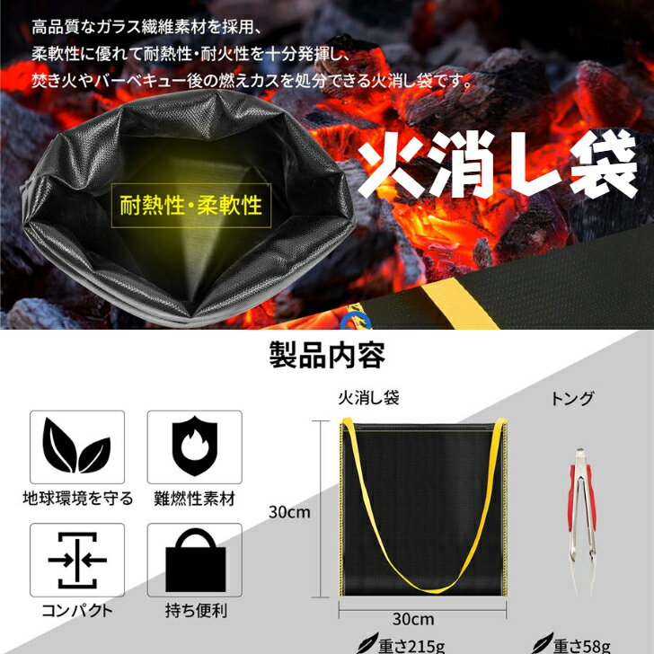 キャンプで困る焚火後の炭の後処理が楽になる火消し袋はいかがでしょうか?耐熱性、難燃性の素材を使用しているので、安全に火消しができ、持ち帰りができますよ。