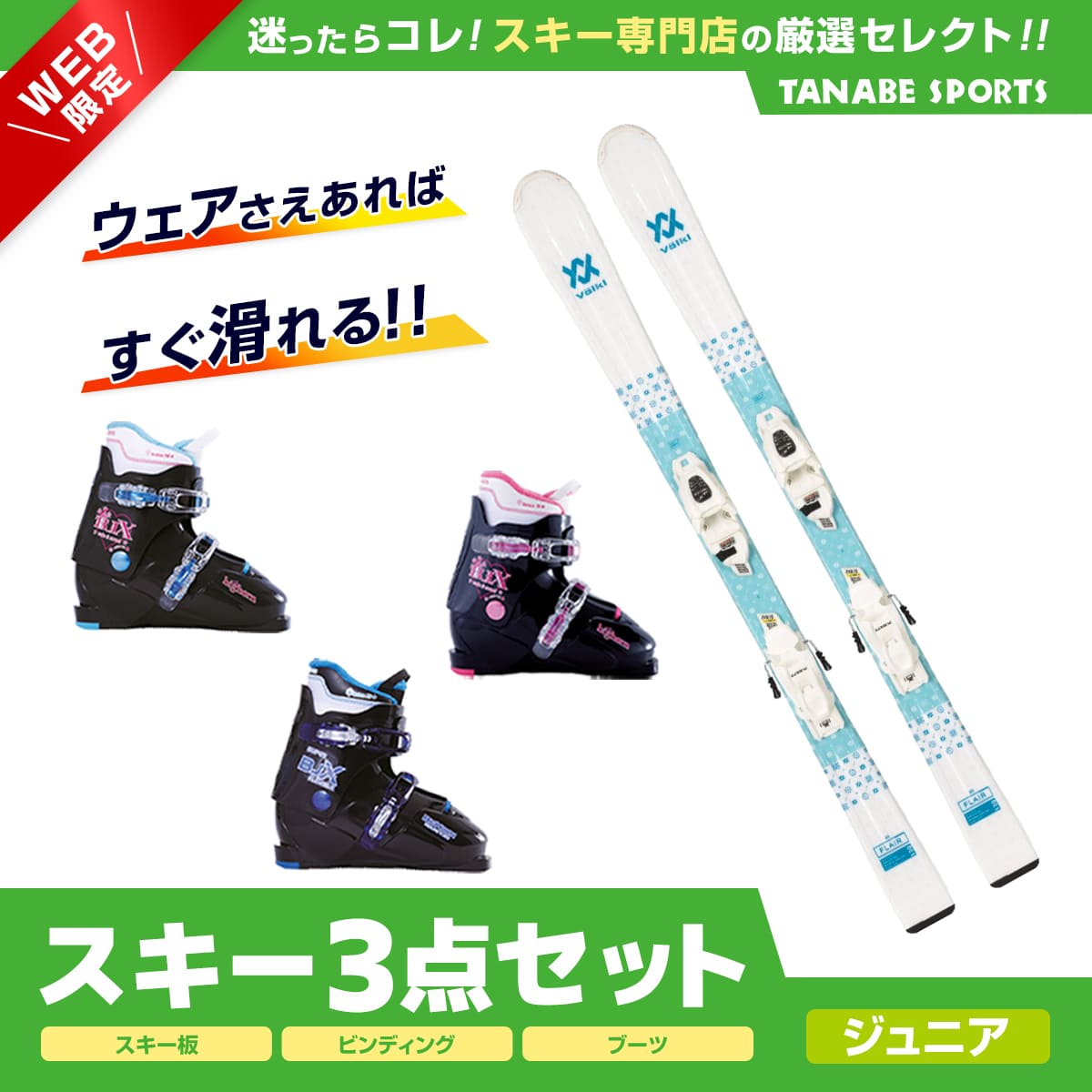 こちらのスキー板とビンディング、ブーツの3点セットはいかが。柔らかく軽量で小さいお子さんでも使いやすいスキー板で、ブーツも脱ぎ履きしやすく防寒性にも優れています。コスパも良く準備も簡単なのがいいですね。