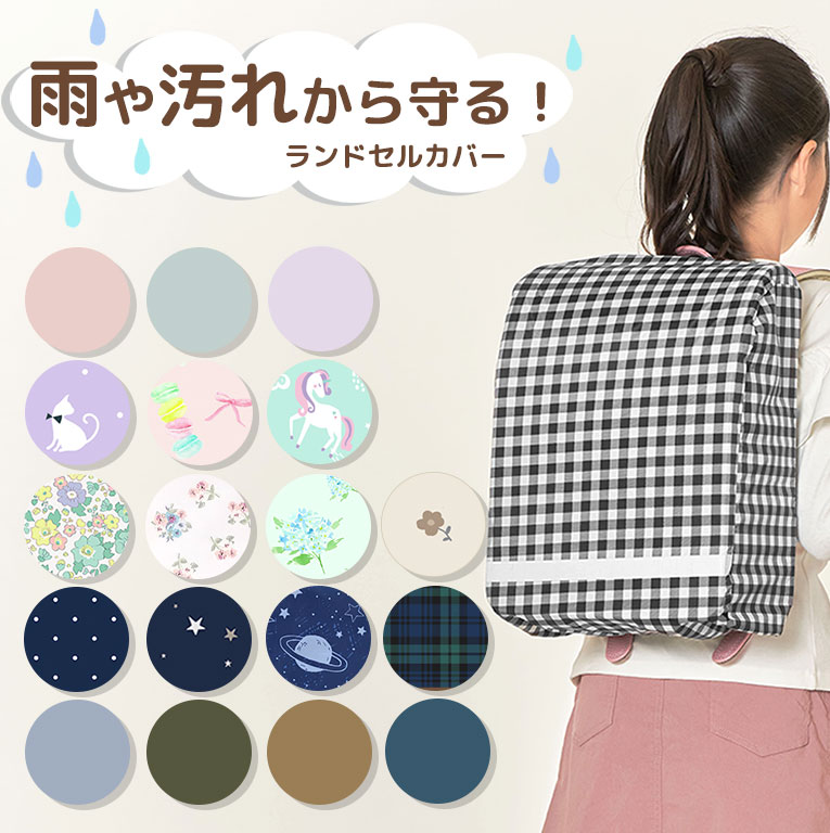 こちらのランドセルカバーはいかがでしょう。かぶせるだけで雨や汚れからランドセルを守ってくれます。ギンガムチェックやボーダーなど可愛い色や柄が揃っていて比較的リーズナブルな所もいいと思います。