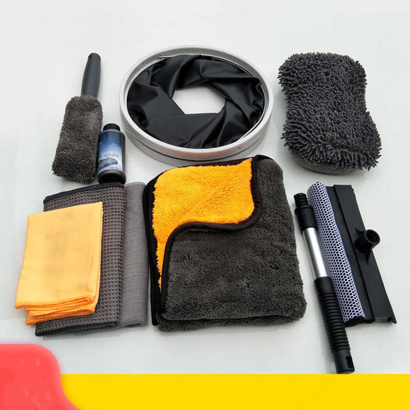 こちらの、洗車道具セットは如何でしょうか?ブラシやマイクロファイバークロス、折り畳みバケツなど10点も揃ったセットです。ほぼこれだけで洗車できますよ。