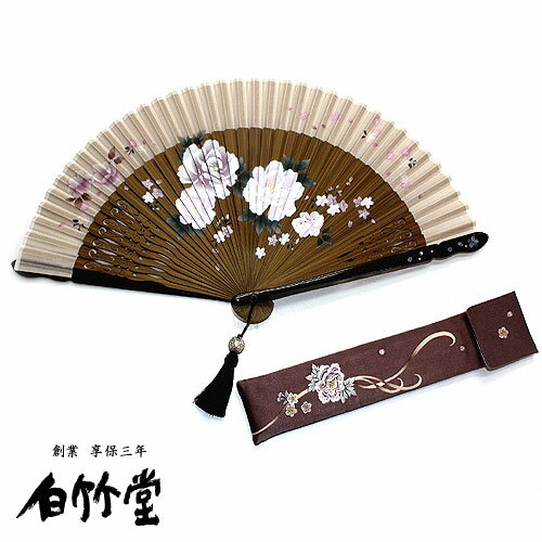 白竹堂の優美扇子セットです。全4種類あります。収納袋付きで便利で高級。軸の部分にも絵がありエレガントで上品。長く愛用出来ますね。