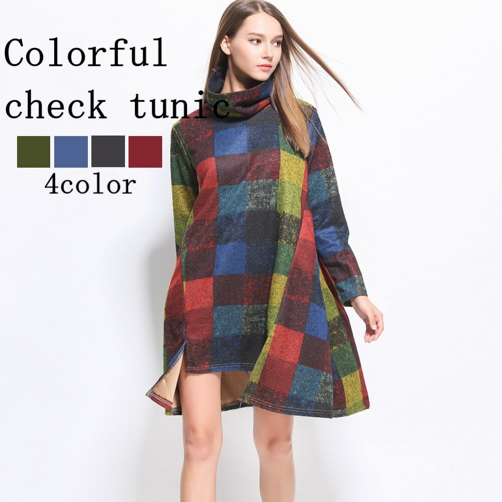 カラフルなチェック柄で目を引くワンピースです。シンプルなAラインのシルエットで、韓国っぽいおしゃれなセンスを感じさせます。秋の街歩きが楽しくなりますね。