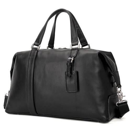 牛側のブラックおボストンバッグはいかがでしょうか?防水なので雨の日でも水をはじいてくれて中にしみこまないです。本革性ですが軽量で持ち運びに便利ですよ。サイズは機内持ち込みサイズにおさまっていますので飛行機移動でもスムーズに移動ができて便利です。手提げにもショルダーにもなる2wayタイプで底には鋲がついていますので床置きしても汚れずに済み持ち運びしやすくおすすめですよ。
