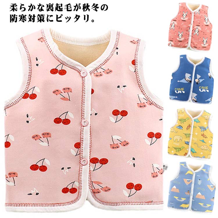 こちらのベビー ベストはどうでしょうか。裏起毛で保温性に優れていますしかわいいデザインが揃っています。