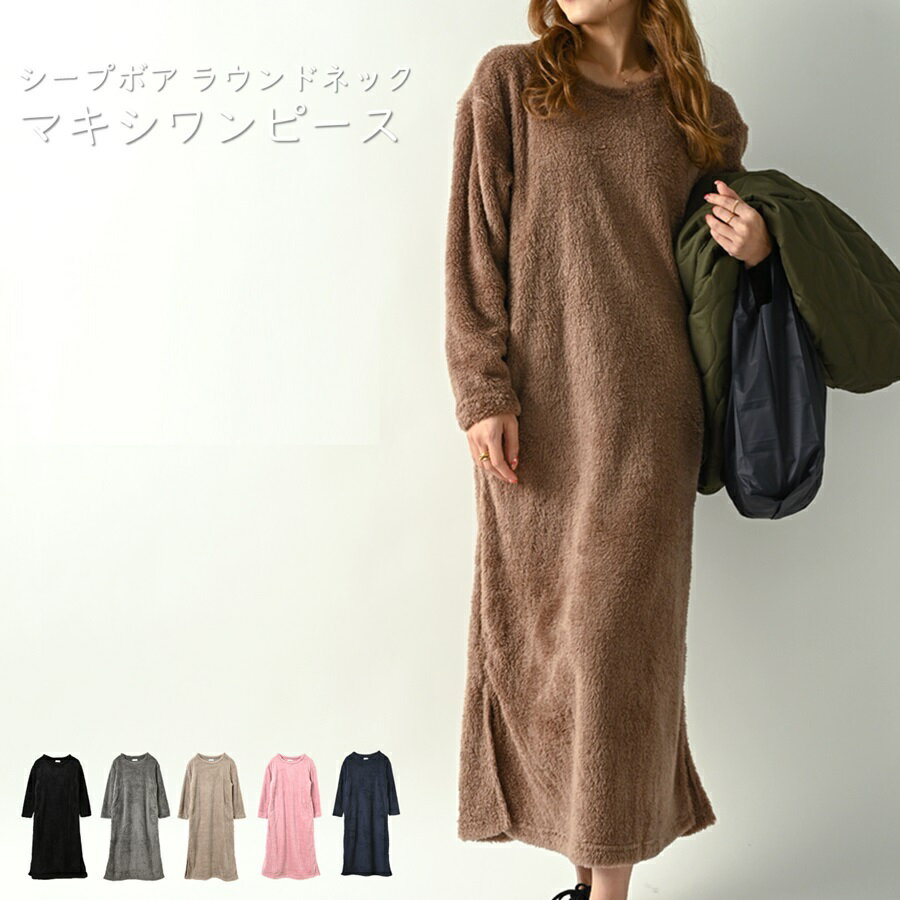 シープボアの温かさが身を包むことで防寒対策がしっかりととれる、ラウンドネックワンピースです。ロング丈で足元までホカホカです。どのカラーリングをチョイスしても綺麗ですね。