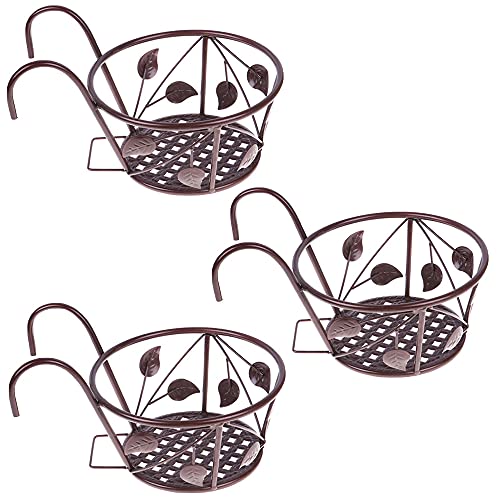 こちらのなないろ館のプラントホルダー3個セットはいかがでしょうか?丈夫なアイアン製の、リーフのモチーフがお洒落なデザインのプラントホルダーです。バルコニーやフェンスなど屋外にも、手すりなど屋内でも引っ掛ける場所があれば手軽にガーデニングを楽しめます。落ち着いたブラックの色合いが様々な場所に馴染みやすい商品でお勧めです。