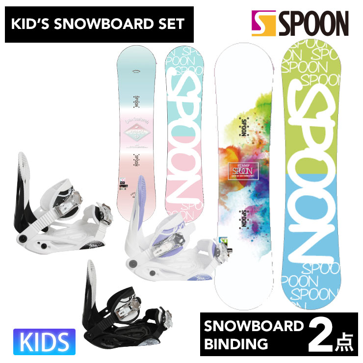 こちらのSPOONのキッズ用スノーボード2点セットはいかがでしょうか?SPOON STAMP DESSERTスノーボードとPH-05ビンディングがセットになった可愛らしい色使いの子供用セットです。フラット形状でエッジの引っ掛かりが弱く、柔らかなボードで初心者にも扱いやすくなっています。カラフルで可愛く、機能性も良い商品でお勧めです。