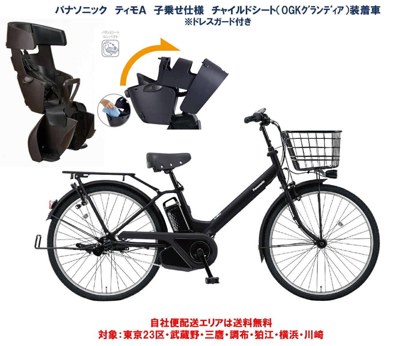 パナソニックの子乗せ電動アシスト自転車「ティモA」”BE-FTA633”、2024年モデルです。 26インチタイヤ、チャイルドシートは着脱容易、サイクリングに適しています。