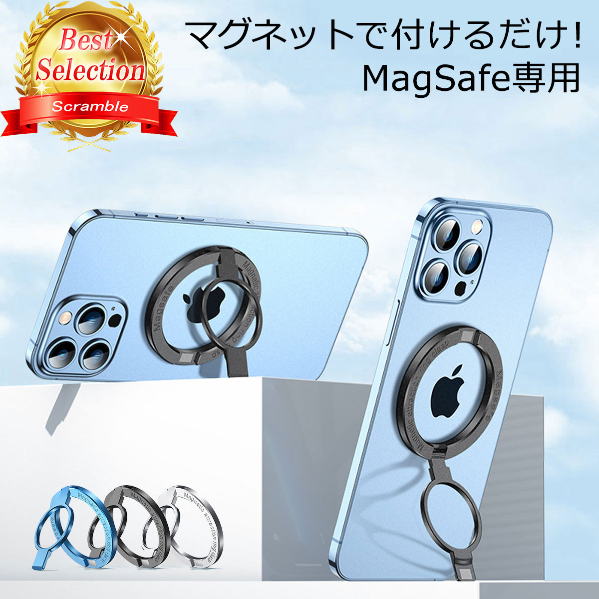 MagSafeに対応したスマホリングです。超強力なマグネットでピタッとくっつきます。360度回転し、縦にも横にも置けるスタンド機能があるのが便利です。カラーが選べます。