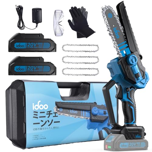 イドーの小型チェーンソーです。軽量のハンディタイプ、充電式のコードレスなので、DIYなどに使い心地がいいと思います。安全ロックも付いていますよ。