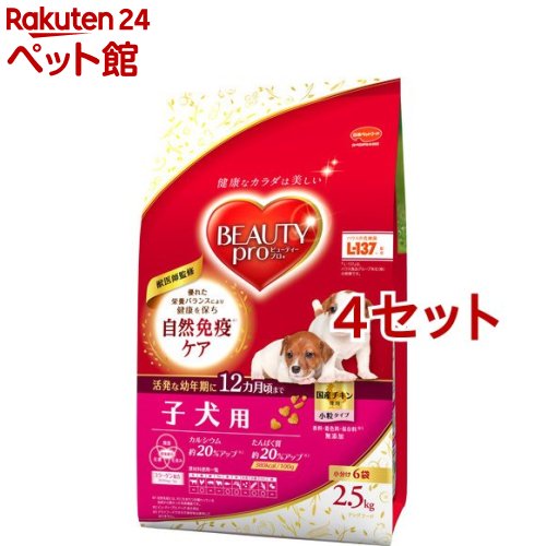 BEATY PRO(ビューティープロ)というブランドの子犬用ドッグフードです。小分け6袋入×4セット。皮膚の健康と毛艶の維持に有効なマリンコラーゲンなどいろんな栄養素をバランスよく配合。