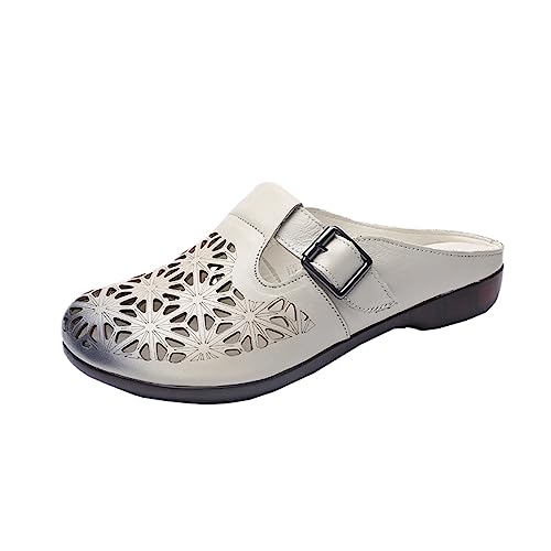 ミュールタイプの本革製のサンダルはいかがでしょうか?アッパーは花柄のメッシュにベルトの飾りがあるデザインです。通気性も抜群です。底は低反発のクッション性がありアウトソールも柔らかくてぐにゃんと曲げられるほど屈曲性があり歩きやすく疲れにくいですよ。サイズは3Eの幅広タイプでしめつけられることがなく快適です。前から見ればサンダルに見えないくらいお洒落です。50代の女性の服装とコーデしやすいですよ。