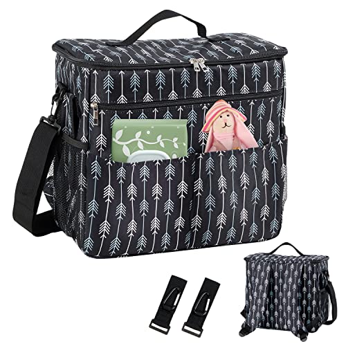 こちらのベビーカー用バッグは横35cm高さ32cmマチ幅19cmある大容量で使い勝手抜群です!防水性もあり雨上がりの地面からのはね上げや突然の雨でも撥水力があります。ベビーカーのハンドルにも下部にもかけられ、外せば手提げ・ショルダー・リュックにもなります。外側にはペットボトルが入るネットポケットやオープンポケットがあり内側にも哺乳瓶を保温保冷できるポケットやファスナーポケットや仕切りがあります。