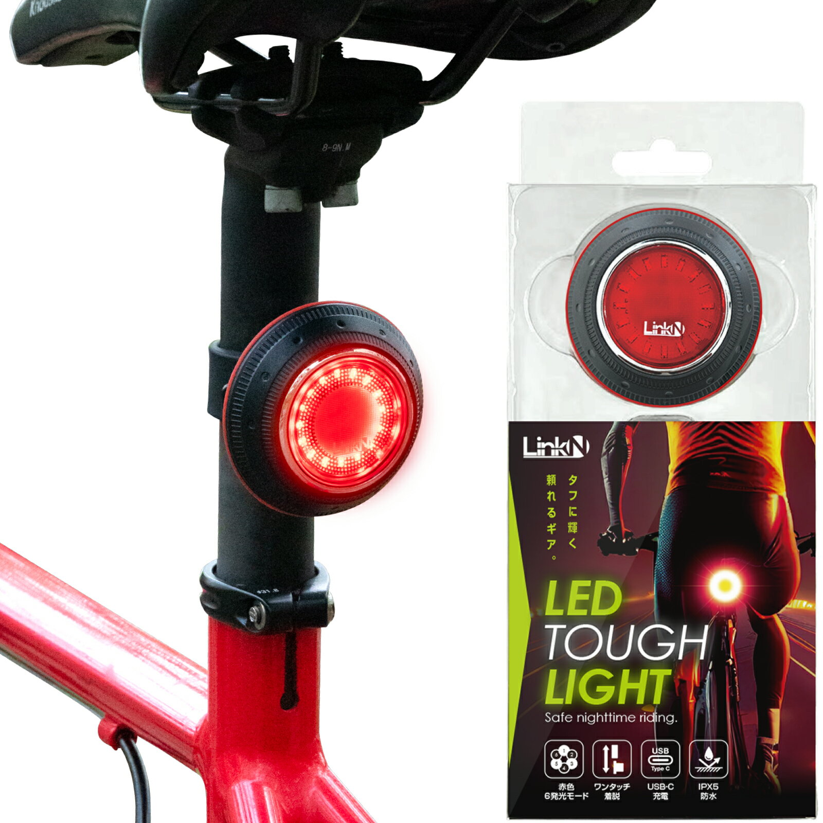 自転車用の汎用型のテールライトで大きな発行面なので安全性が重視されており、USBでの充電ができて、最大60時間の連続発光ができて使い易いです。