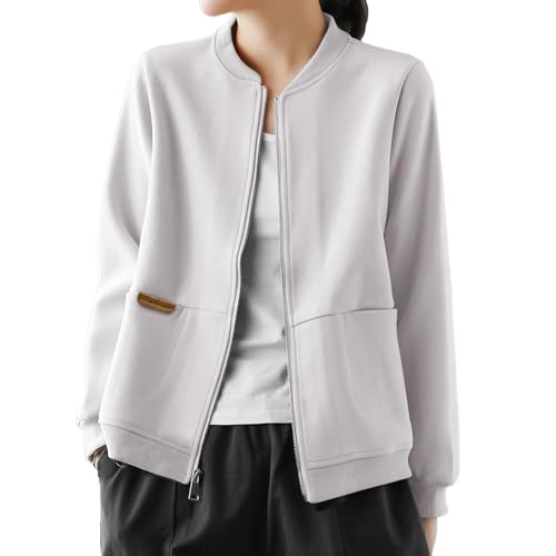 こちらジップアップタイプのスウェット地アウターです。ファスナーを開けてアウターとして着られるし、閉めればスウェットトップスとしても着られるので、便利だと思います。ファスナーが縦ラインのポイントになりますし、ポケット部分の皮のタグがおしゃれで高見えもしますね。カジュアルだけどシンプルなので、パンツやスカートなど何にでも合わせやすく、大人っぽくすっきりとした着こなしができそうです。