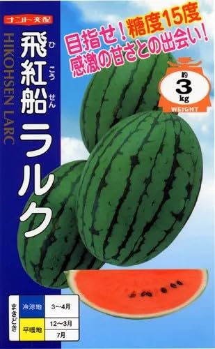 スイカが大好きで自分で作りたいという人のための小玉スイカ、飛紅船ラルクの種です。冷蔵庫に丸ごと入れることができるラグビーボール形の小玉スイカで、甘みとシャリ感が特徴です。花粉の発生が多く着果性に優れているため家庭菜園向きのスイカで、糖度も13度前後で高く、裂果や空洞果の発生も少ないため、家庭菜園初心者も挑戦することができます。