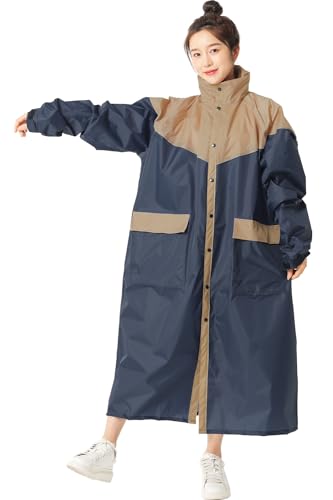 ベージュとネイビーのデザインで、おしゃれです。ロング丈で防水性が高く、体が濡れずに安心です。暗リュックサックも中に背負えて便利です。
