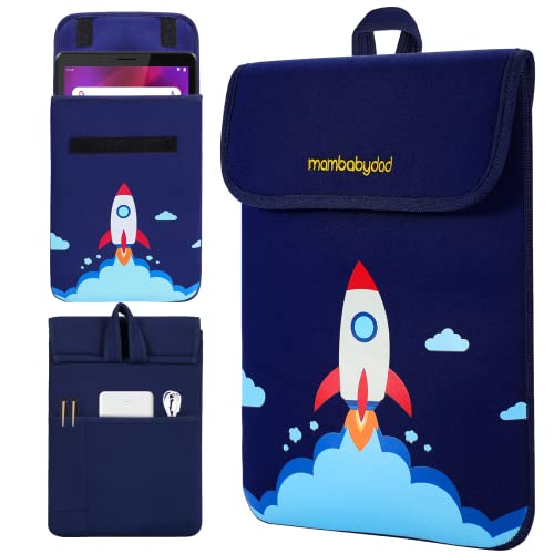 ランドセルに入るサイズで13インチ以下のタブレットが入るこちらのタブレットケースはいかがでしょうか?男の子が好きな落ち着いたネイビーカラーにロケットの模様が入っています。タブレットを使う時のイヤホンや配線類など細かい物も一緒に入れられる便利なポケット付き!雨の日も水濡れしないように防水性もありお薦めですよ。