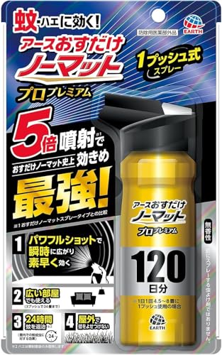 おすだけノーマット プロプレミアムは、ワンプッシュで簡単に蚊を駆除できる無香料タイプです。屋内で使いやすく、120日間効果が持続するため、長期間安心して蚊対策が可能です。防除用医薬部外品なので安全性も高く、家族みんなに優しいおすすめの蚊取りスプレーです。