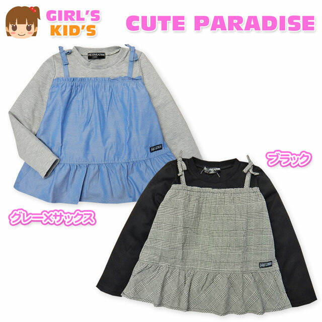 こちらのキャミソールを重ねたようなおしゃれなロンTはいかがでしょうか。裾のフリルや肩のリボンがかわいいアクセントになっています。