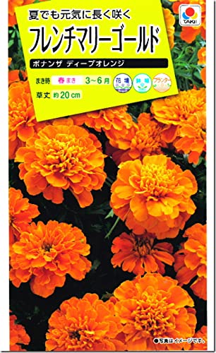 濃く鮮やかオレンジの八重咲きの花を咲かせるマリーゴールド、ボナンザディープオレンジの種はいかがでしょうか。花付きかよく、開花期間も長いので、お庭を長く賑やかに彩ってくれます。