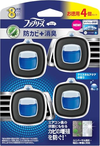 ファブリーズの車用イージークリップは、防カビと消臭効果があり、クリスタルアクアの爽やかな香りが長続きします。コンパクトで取り付けも簡単、車内のにおい対策に最適です。2.5mLの小容量ですが、4個セットでコスパも良く、気軽に新鮮な空間を保てるおすすめの商品です。