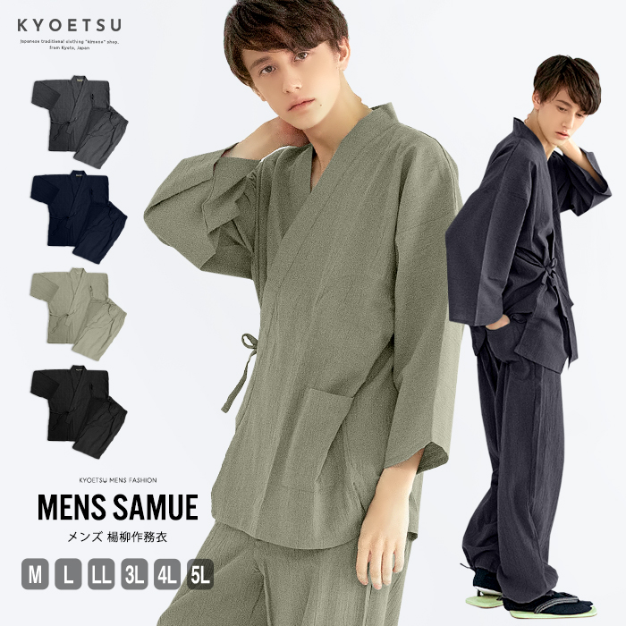 メンズ用のおしゃれな作務衣です。カジュアルなデザインですし、ゆったりとした着心地。サイズもそろっています。アウトドアでも使いやすく、部屋着にもぴったりですよ。