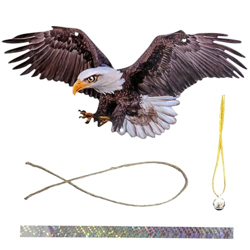 ワシが大きく翼を広げて威嚇しているデザインで、ツバメなどの鳥よけ効果があります。反射板がついていて、光を反射してより効果が高いです。ヒモや、鈴などもついていて便利です。