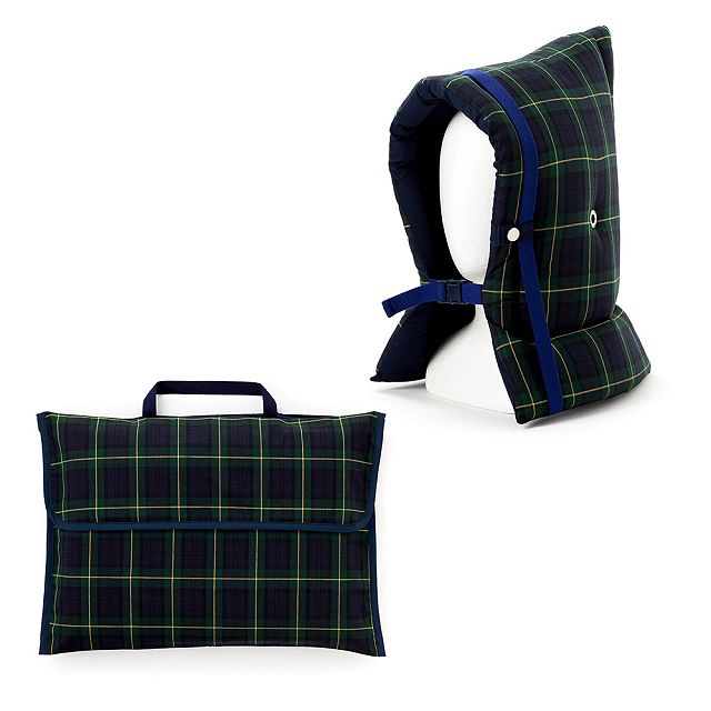 この防災頭巾・防災頭巾カバーの2点セットは、小学校の椅子背もたれにも取り付け可能なカバーがセットになっており、厚手で丈夫な作りが特徴で、頭部をしっかり守る防災頭巾と、普段は座布団や背もたれとして使えるタータンチェック・ダークグリーンのおしゃれなデザインが大きなメリットです。
