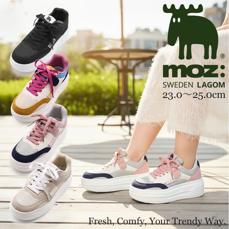 北欧スウェーデン発のmoz(モズ)は、愛らしいエルク(ヘラジカ)のロゴが目を引くデザイン。4cm以上の厚底ソールで脚長効果がありつつ、軽量設計とクッション性の高い中敷きにより「驚くほど疲れにくい」と評判です。メッシュ素材で蒸れにくく、季節を問わず大人のカジュアルコーデを格上げしてくれる一足です。