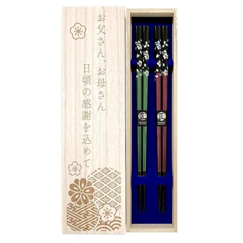 食洗機対応で毎日使いやすく、美しい銀桜花デザインの夫婦箸。緑と紫のセットで夫婦や両親への贈り物に最適。桐箱入りでラッピングも付いておしゃれに贈れるため、母の日・父の日や初任給のギフト、日頃の感謝を伝えるプレゼントとして喜ばれる、実用性と上品さを兼ね備えた特別なアイテムです。